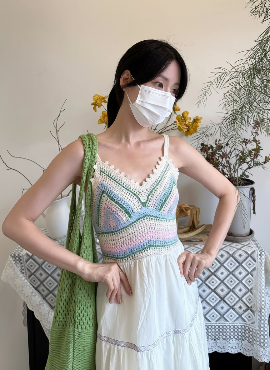 "햇살처럼 부드럽게 감싸는 니트, 어깨 위로 흘러내리는 여름의 포근함."